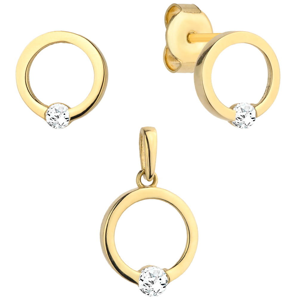 Złote kolczyki z delikatnym kółeczkiem oraz elegancka zawieszka ozdobiona cyrkonią, tworzące harmonijny komplet biżuterii. Idealny dodatek do każdej stylizacji, podkreślający subtelność i blask naturalnego uroku.