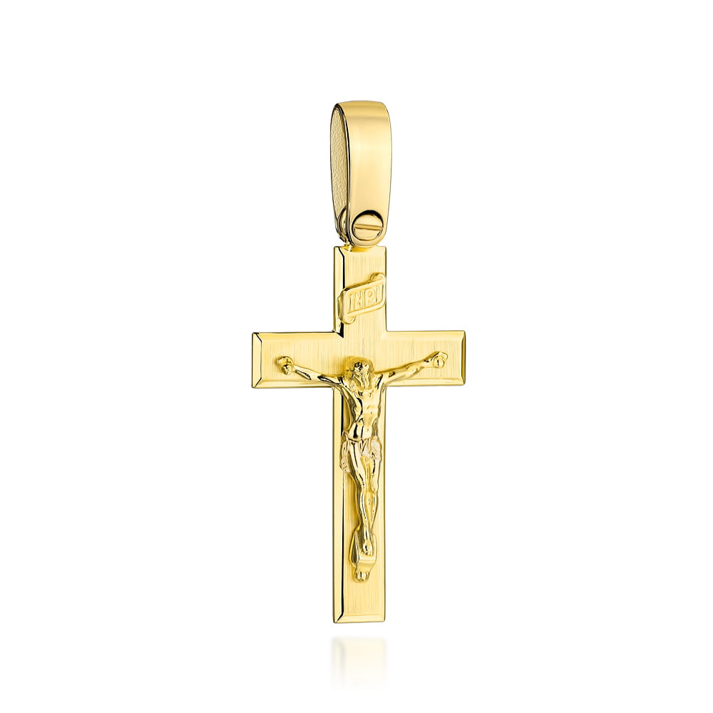 Krzyż złoty satynowany z Jezusem to elegancki symbol wiary, wykonany z najwyższej jakości metalu i delikatnie ozdobiony subtelnymi detalami. Idealny zarówno na codzienne noszenie, jak i jako wyjątkowy prezent dla bliskiej osoby, podkreślający duchową elegancję i trwałość.