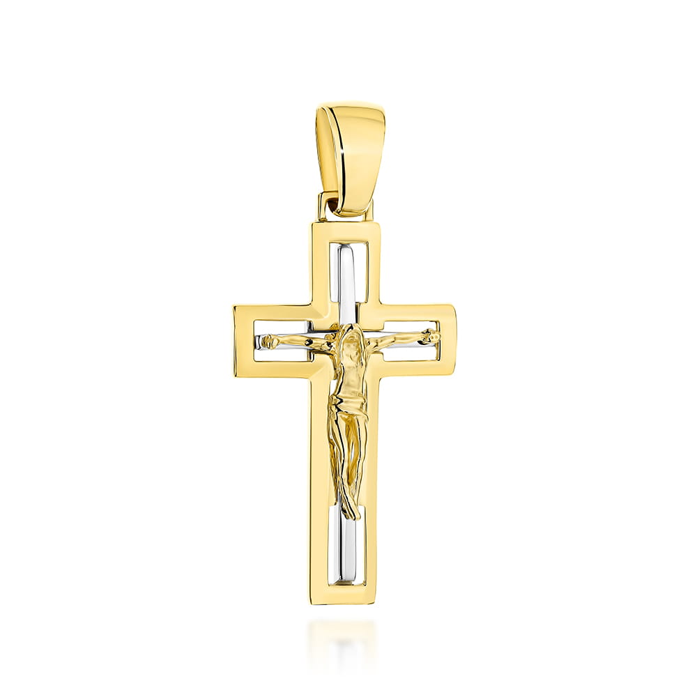 Elegancki krzyż złoty przedstawiający ukrzyżowanego Jezusa w dwóch odcieniach złota, idealny do codziennej modlitwy i wyrafinowanego stylu. Dodaj go do swojej kolekcji, aby podkreślić duchowość i luksusowy blask biżuterii.