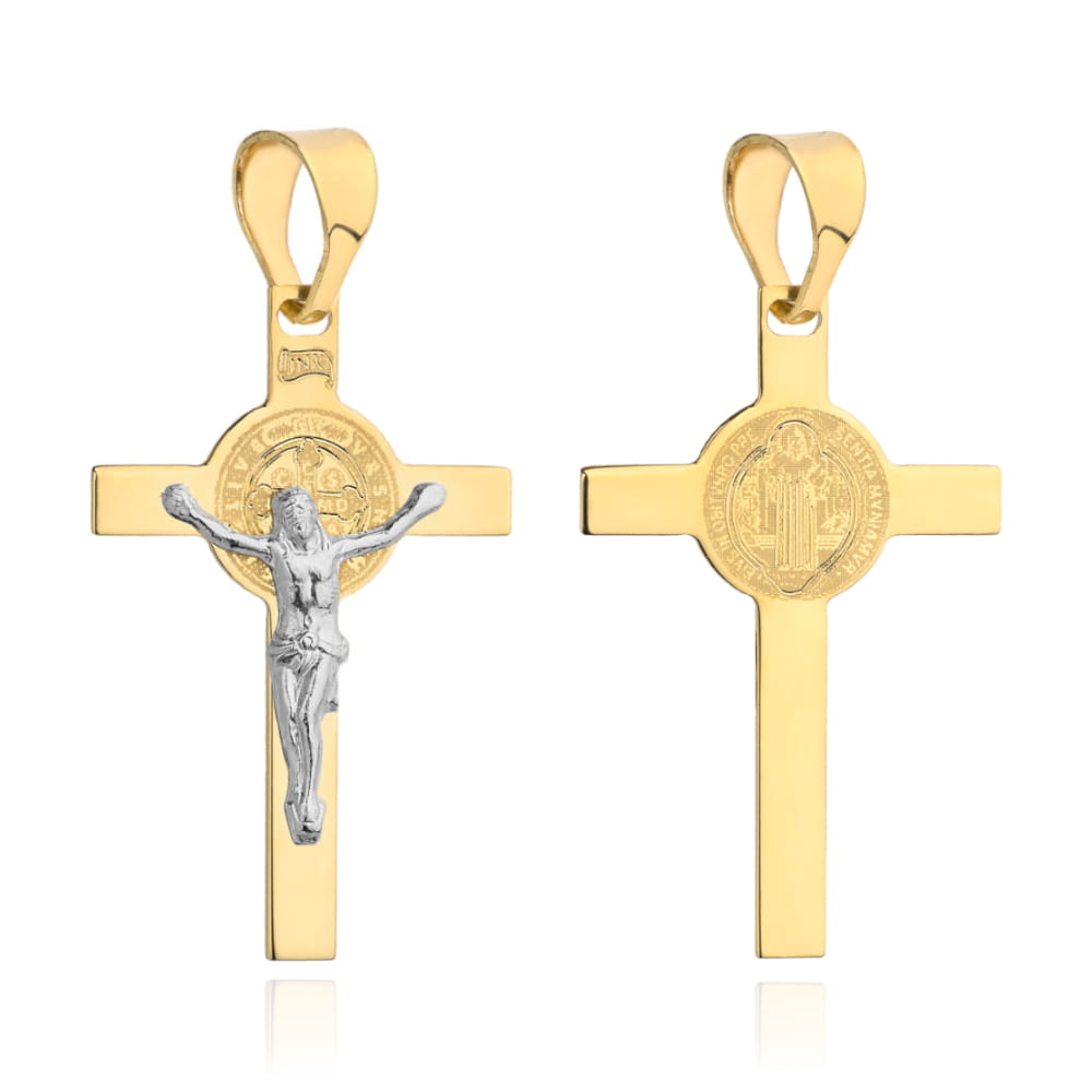 Elegancki złoty krzyżyk benedyktyński w dwóch odcieniach złota, idealny na codzienne noszenie lub wyjątkowe okazje. Subtelne połączenie klasyki i nowoczesności podkreśla indywidualny styl, zachęcając do zakupu.