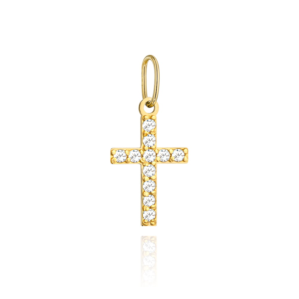 Złoty krzyżyk ozdobiony subtelnie rozmieszczonymi cyrkoniami to elegancki akcent, który podkreśli wyrafinowany styl każdej kobiety. Idealny zarówno na specjalne okazje, jak i do codziennego noszenia – dodaj blasku swojej kolekcji biżuterii już dziś.