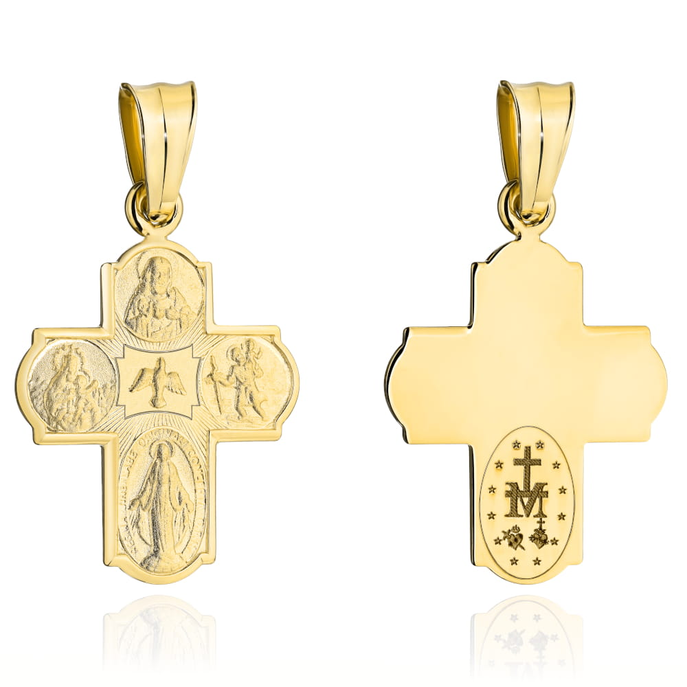 Krzyżyk złoty z Duchem Świętym, rozświetlony detalami klasycznego stylu, stanowi elegancki akcent dla każdego wyrafinowanego zestawu biżuterii. Dzięki swojemu imponującemu rozmiarowi i subtelnej symbolice, przyciąga uwagę zarówno w codziennych stylizacjach, jak i na specjalne okazje.