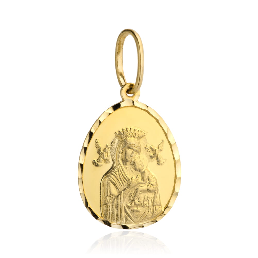Złoty medalik z ikoną Matki Boskiej Nieustającej Pomocy, ozdobiony delikatnym dziecięcym dzieckiem, to elegancki symbol duchowej ochrony i miłości. Idealny prezent dla osób szukających ponadczasowego, religijnego akcesorium do codziennego noszenia.