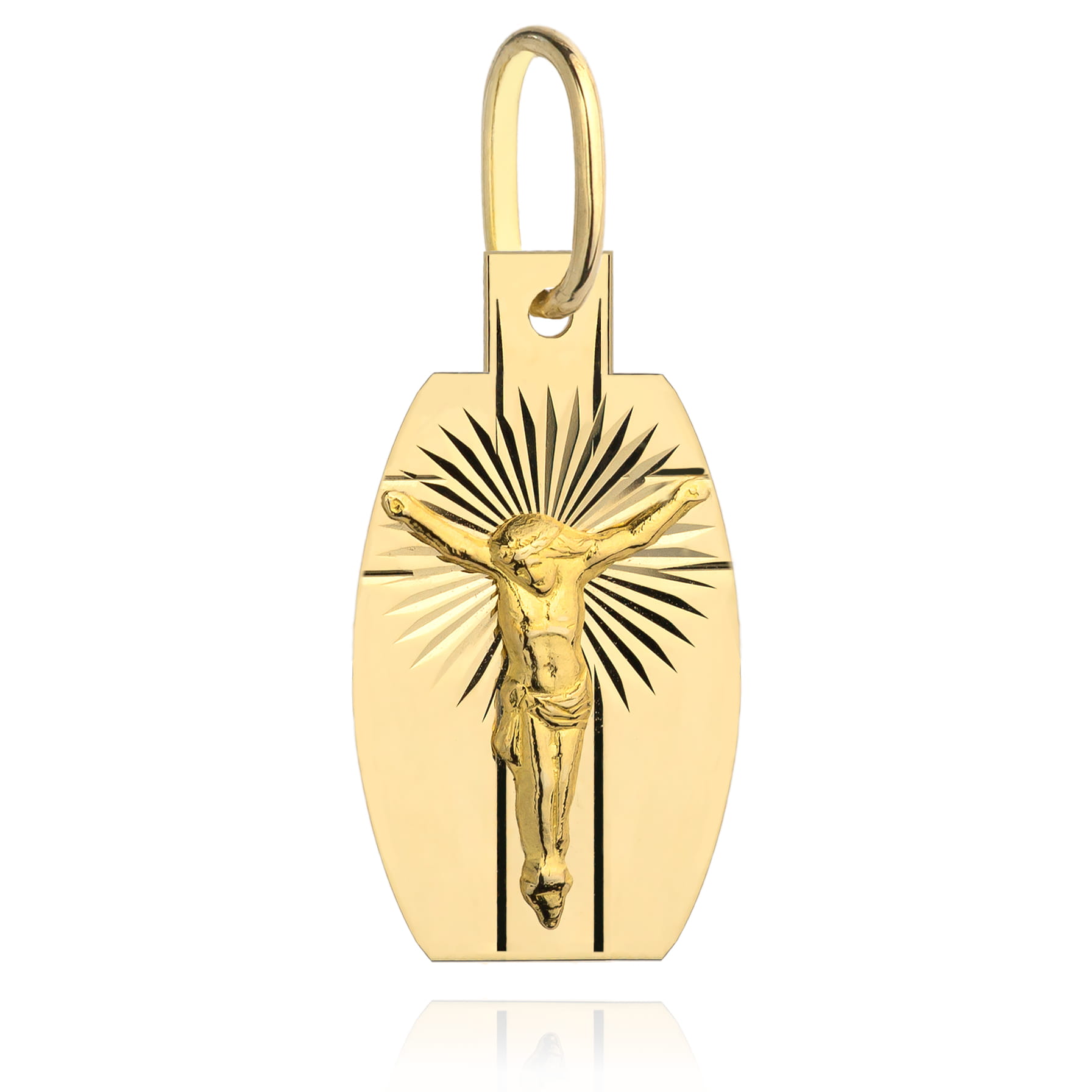 Złoty medalik z ukrzyżowanym Jezusem to elegancki symbol wiary, który podkreśla duchową głębię i klasyczny styl. Drobne zdobienia na blaszce oraz wysokiej jakości złoto sprawiają, że nasz medalik jest nie tylko modnym dodatkiem, ale i trwałym skarbem na długie lata.