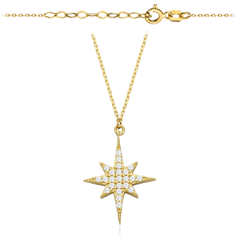 Elegancki naszyjnik Gwiazda Polarna, wysadzany diamentowymi cyrkoniami, przyciąga spojrzenia delikatnym połyskiem i subtelnym blaskiem. Idealny na specjalne okazje, podkreśla indywidualność i dodaje niepowtarzalnego uroku każdej stylizacji.