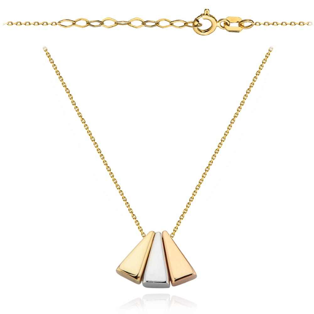 Elegancki naszyjnik z ruchomymi trójkątami w trzech odcieniach złota to subtelny akcent, który podkreśli Twoją indywidualność. Idealny na każdą okazję, łączy nowoczesny design z klasycznym blaskiem złota, zachęcając do noszenia go na co dzień.