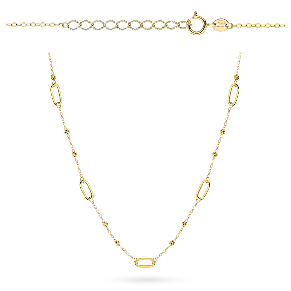 Złoty naszyjnik z diamentowymi kulkami i ogniwami to elegancki akcent, który podkreśli Twoją wyjątkowość. Idealny na specjalne okazje i codzienne wyjścia, gwarantuje blask oraz ponadczasowy styl.