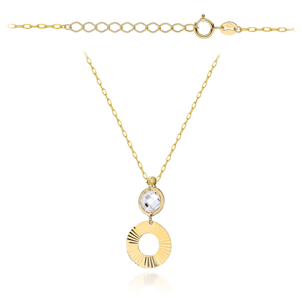 Elegancki naszyjnik w złotym wykończeniu z delikatnym białym kamieniem, który przyciąga uwagę subtelnością. Dodatkowy diamentowany ring podkreśla luksus i sprawia, że całość staje się idealnym dodatkiem na każdą okazję.