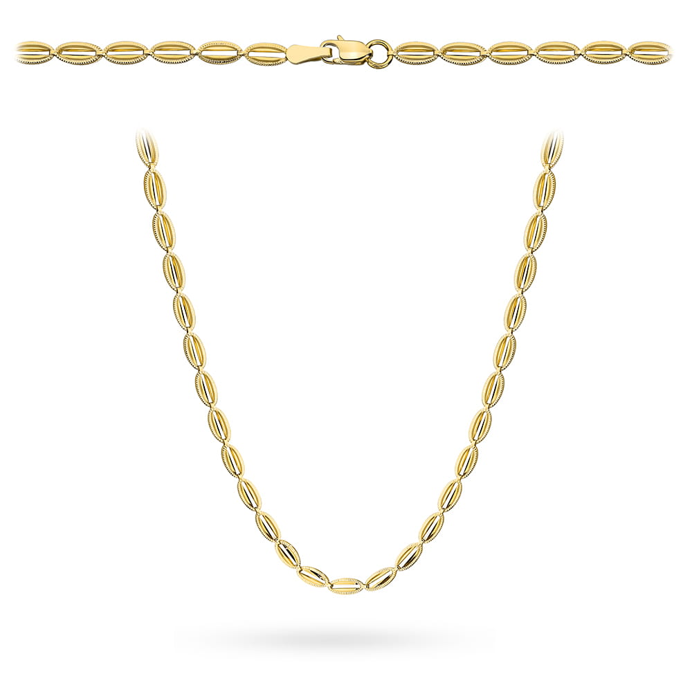 Złoty naszyjnik z diamentowanymi owalami to wyraziczona połączenie elegancji i nowoczesnego designu, który zachwyca swoim blaskiem. Delikatne owalowe diamenty przywołują na myśl mgłę porannego słońca, a subtelny złoty połysk podkreśla naturalną piękność każdej kobiety. Ta biżuteria to nie tylko ozdoba, lecz także wyraz osobistego stylu i ponadczasowego gustu. Idealny wybór na wyjątkowe okazje lub jako codzienna ozdoba, która rozświetli każdy dzień. Dzięki wysokiej jakości wykonania i dbałości o detale, nasz naszyjnik stanie się Twoim najcenniejszym skarbem