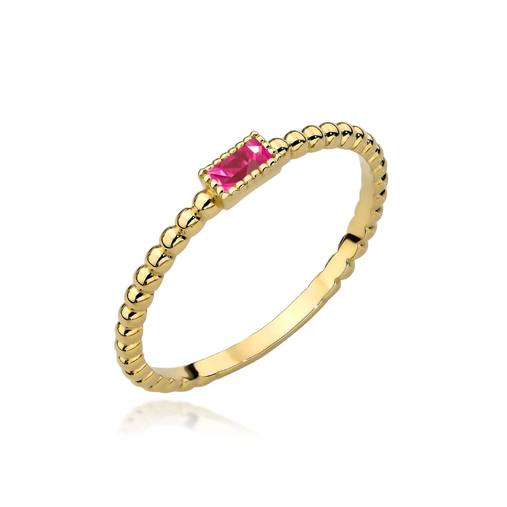 Elegancki pierścionek z delikatnymi złotymi kulkami i centralnym kamieniem fuksji, który podkreśli subtelność Twojego stylu. Idealny wybór na wyjątkowe okazje, łączący klasyczną elegancję z nowoczesnym blaskiem.
