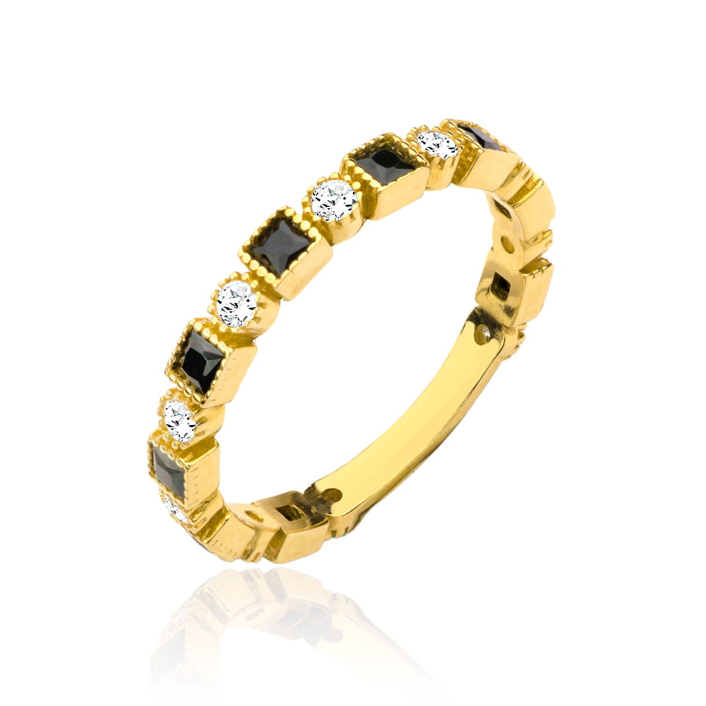 Elegancki pierścionek z czarnym kamieniem w kwadracie, ozdobiony cyrkoniami, idealny dla kobiet ceniących wyrafinowany styl i subtelne blaski. Złota podstawa podkreśla luksusowy charakter, a unikalny design sprawia, że stanowi niepowtarzalny dodatek na każdą okazję.