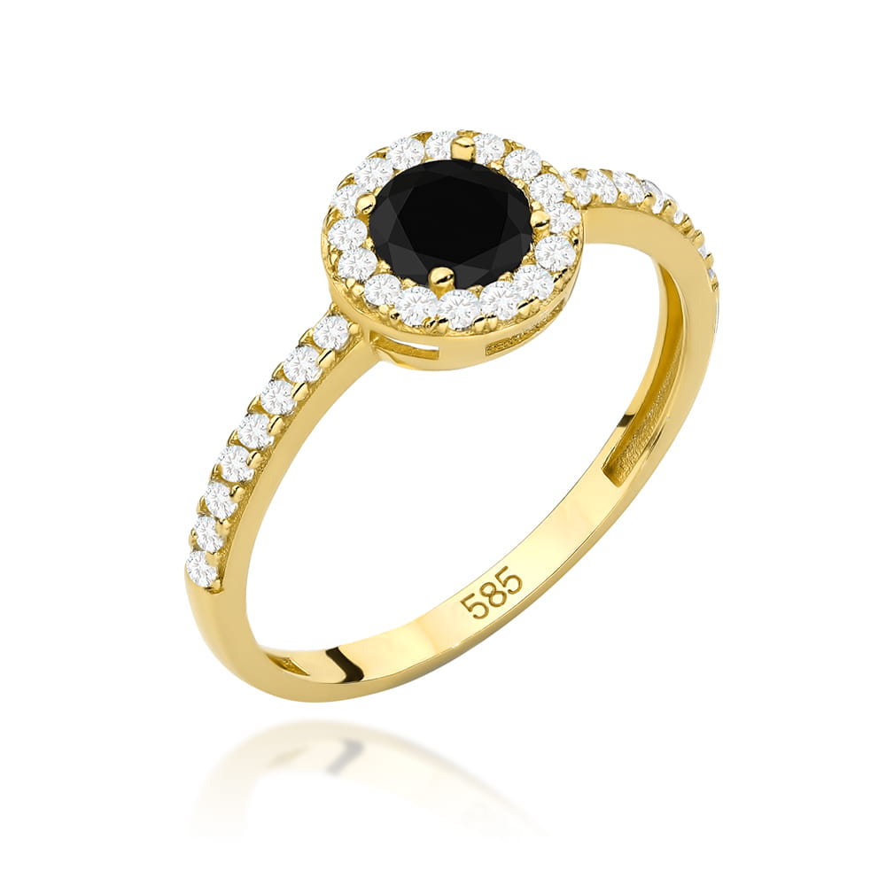 Elegancki pierścionek w złotej oprawie, zdobiony czarnym kamieniem i subtelnie otoczony cyrkoniami. Idealny wybór dla osób szukających wyrafinowanego, nowoczesnego designu.