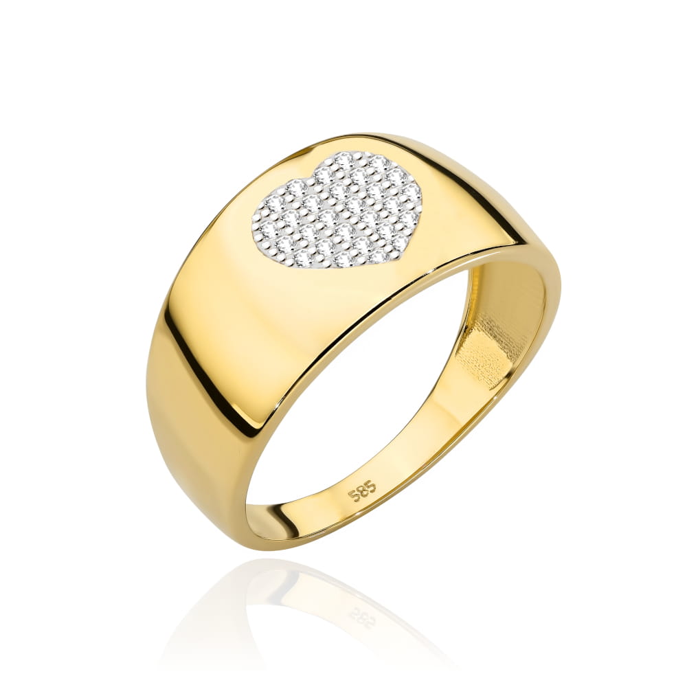 Elegancki, szeroki pierścionek złoty z sercem wysadzanym cyrkoniami – idealny wybór dla miłośniczek klasycznej biżuterii, która ceni wyjątkowy blask i subtelny design. Dzięki starannemu wykonaniu w wysokiej jakości złocie, ta biżuteria stanie się nieodłącznym akcentem każdej stylizacji.