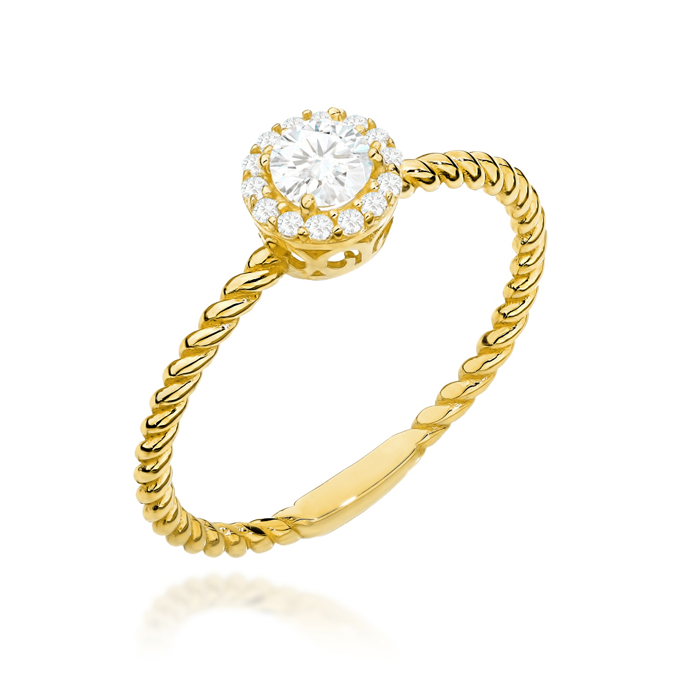 Delikatny pierścionek złoty z centralną cyrkonią, otoczony drobnymi kamieniami na eleganckiej plecionej szynie. Idealny wybór dla kobiet ceniących subtelność i blask, który podkreśli każdą stylizację.