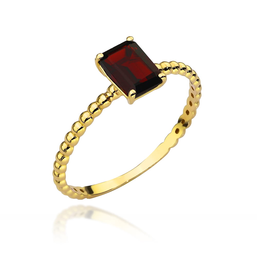 Elegancki pierścionek złoty z kolekcji COLORFUL STONE, ozdobiony kwadratowym granatem, łączy klasykę z nowoczesnym blaskiem. Idealny dodatek na każdą okazję, podkreślający indywidualność i styl każdego noszącego.