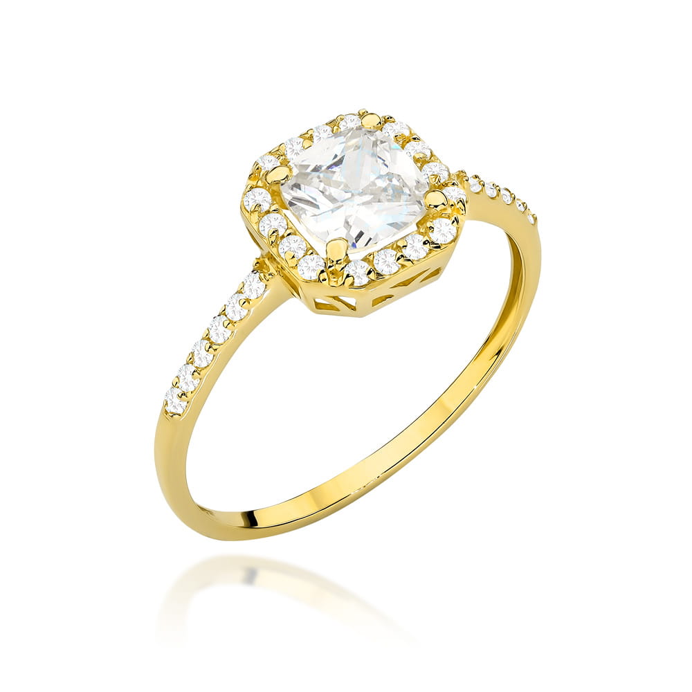 Zachwycający pierścionek z błyszczącym złotym obręczą, ozdobiony kwadratowym kamieniem oraz rozświetlającymi cyrkoniami. Idealny wybór dla kobiet ceniących elegancję i subtelny blask, który podkreśli każdą stylizację.
