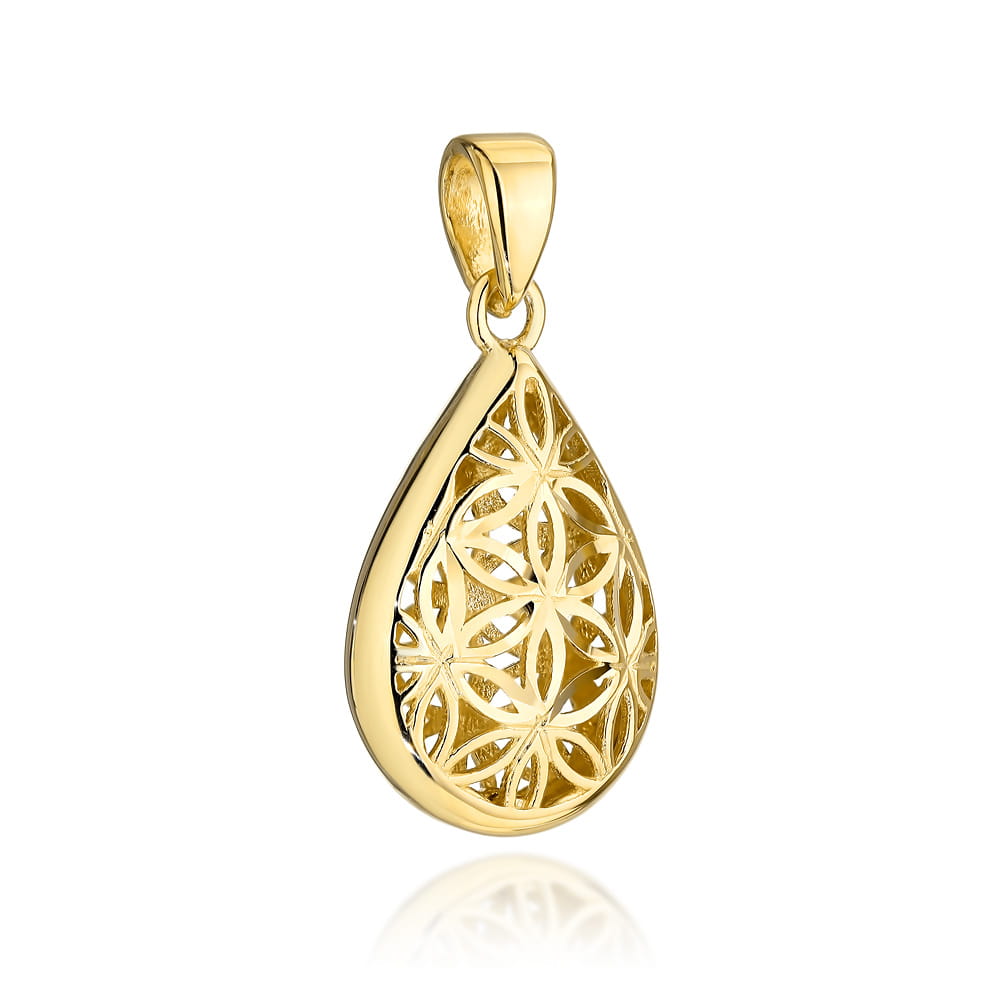 Elegancka złota zawieszka w formie ażurowej łezki, zdobiona delikatnymi kwiatami, to idealny dodatek do każdej biżuterii. Jej subtelna struktura i klasyczny design sprawiają, że wyróżnia się zarówno w codziennym noszeniu, jak i na specjalnych okazjach.