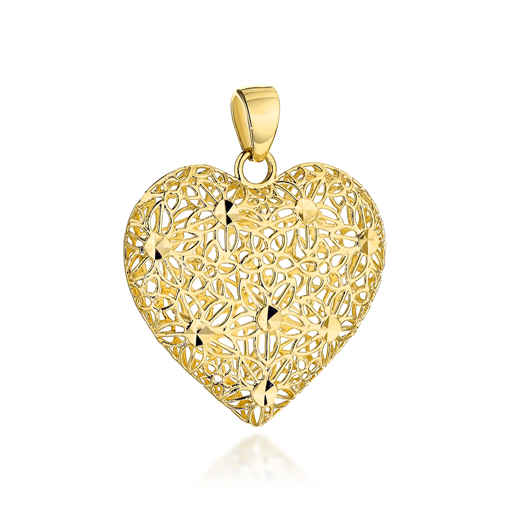 Zawieszka z ażurowego serca w złotym wykończeniu, zdobiona delikatnym diamentowaniem, idealna na eleganckie wyjście i codzienną subtelność. Dodaj blasku swojej biżuterii dzięki unikalnemu połączeniu klasyki i nowoczesnego designu.