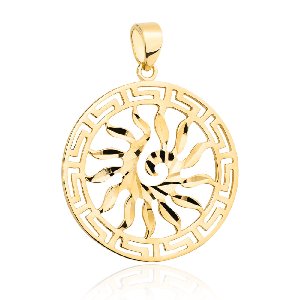Zawieszka w złotym odcieniu, inspirowana motywem słońca i greckiego wzoru, dodaje elegancji każdemu naszyjnikowi. Idealna na prezent lub do codziennego noszenia, podkreśla styl i wyrafinowanie.