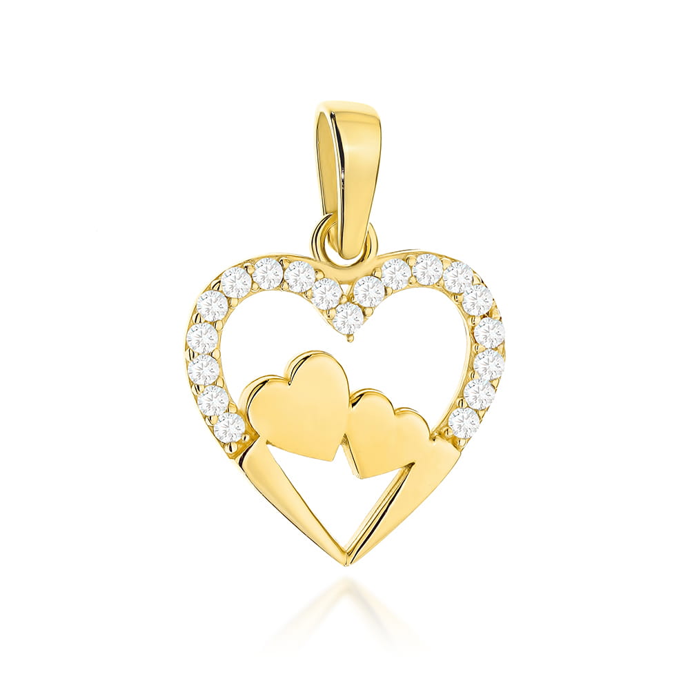 Zawieszka w złotym wykończeniu, przedstawiająca splecione serduszka z centralnym sercem wysadzanym cyrkoniami, to elegancki akcent podkreślający romantyczny charakter każdej stylizacji. Idealna dla miłośniczek klasycznej biżuterii, przyciąga uwagę subtelnością i blaskiem, zachęcając do wyrażenia uczucia w stylowy sposób.